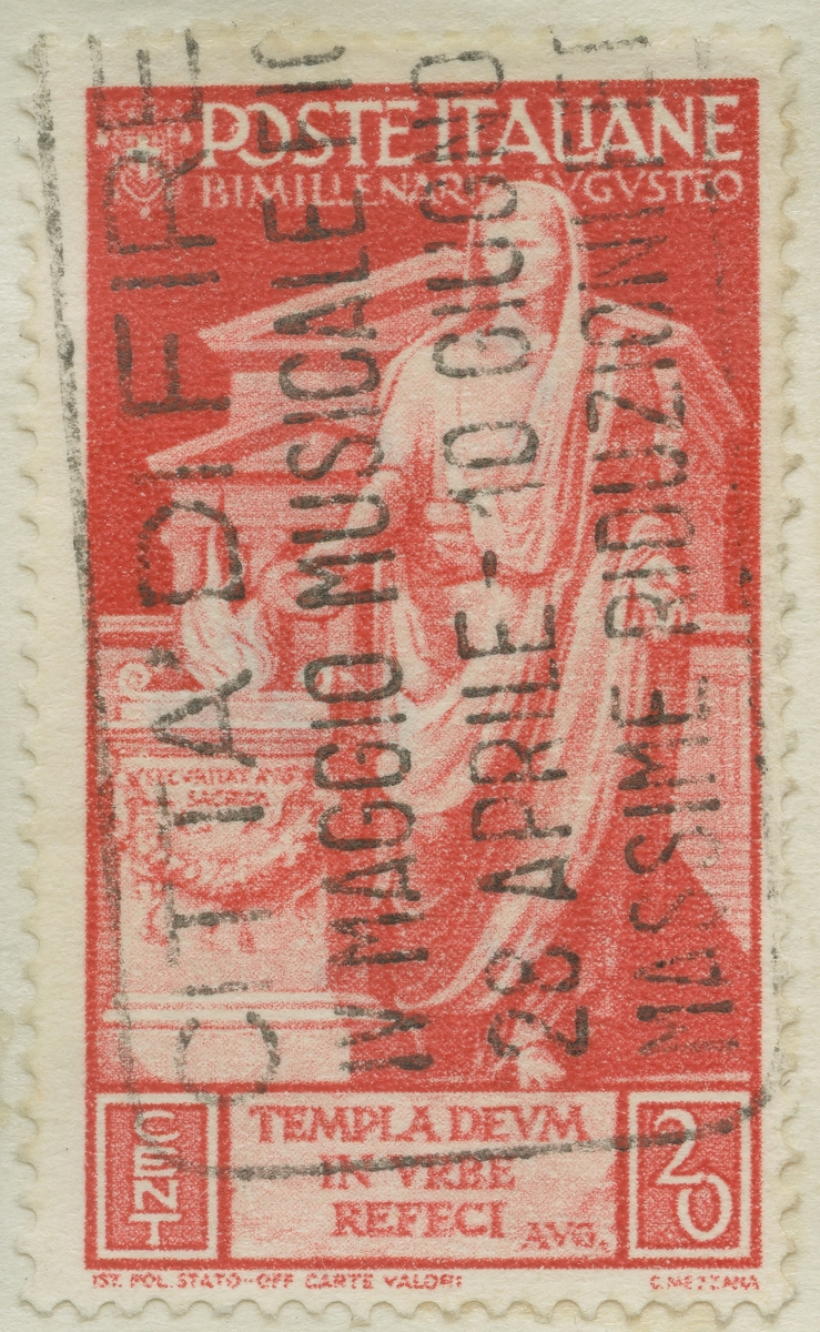Frimärke från Italien, 1937. Motiv av Romersk tempel: Kejsar Caesar Augustus (Gaius Julius Caesar Octavianus), Roms förste kejsare, offrar till gudarna (63 f. Kr- 14. e Kr.). "2000 årsminne av Octavianus födelse 63 f. Kr- 1937 e. Kr.".