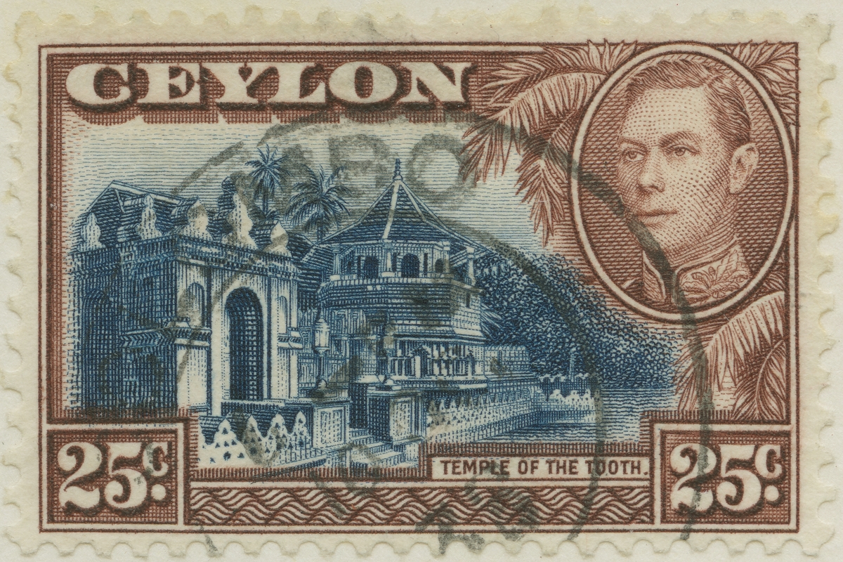 Frimärke från Ceylon, 1938. Motiv av Tandens Tempel i staden Kandy på Ceylon. "Så kallad därför att en av Buddhas tänder förvaras här som relik." Ovan t.v. Kung George VI.