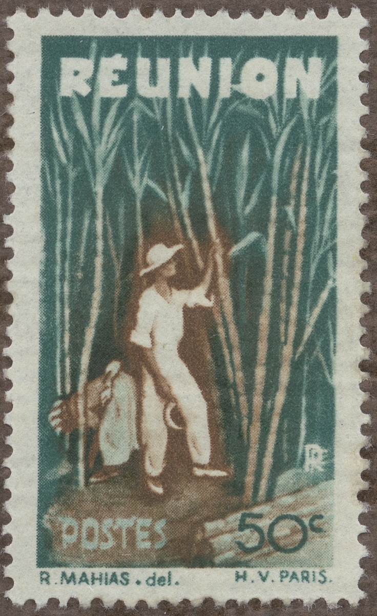 Frimärke från Reunion, 1945. Motiv av skördearbete på Reunion. Sockerskörd öster om Madagaskar.