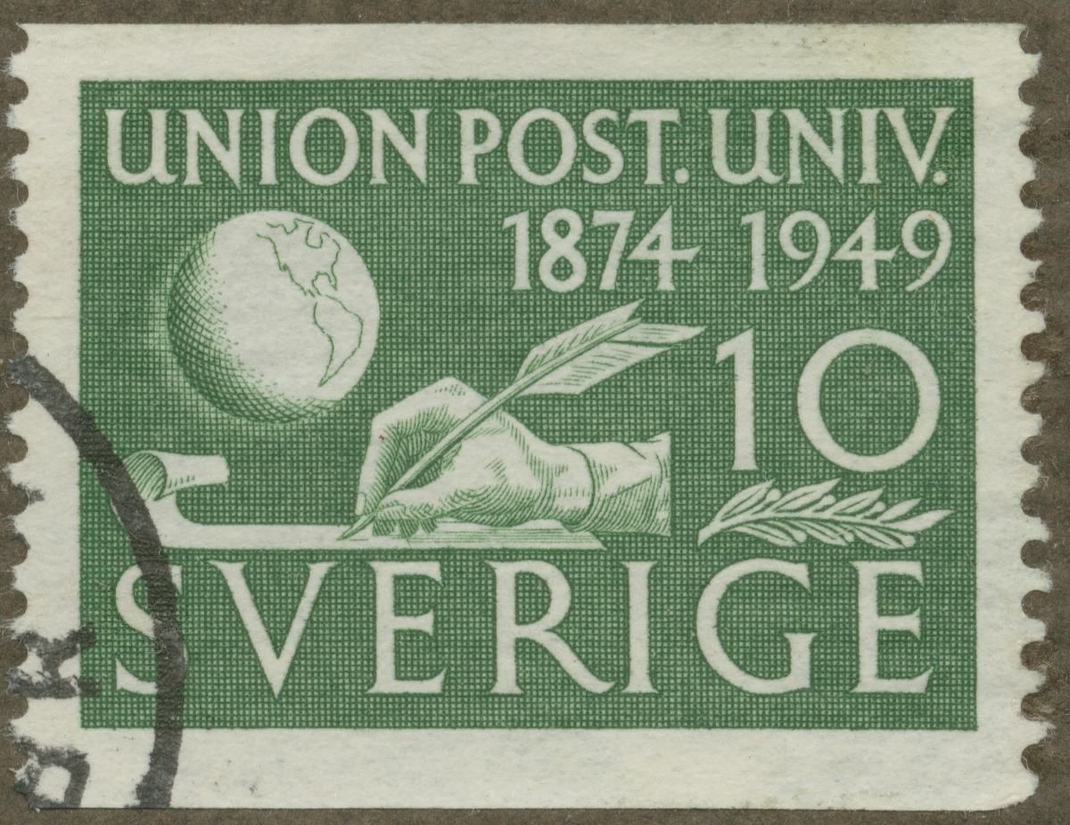 Frimärke från Sverige, 1949. Motiv av jordglob och skrivande hand. "Symbol: U. P. U. 75 år".