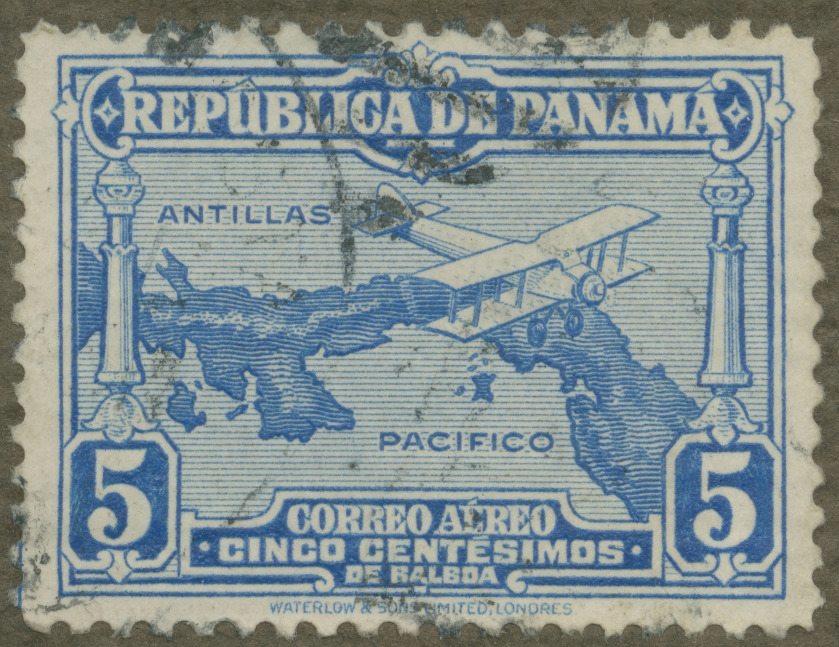 Frimärke från Panama, 1930. Motiv av flygplan, tvådäcksjagare, över Panamas karta.