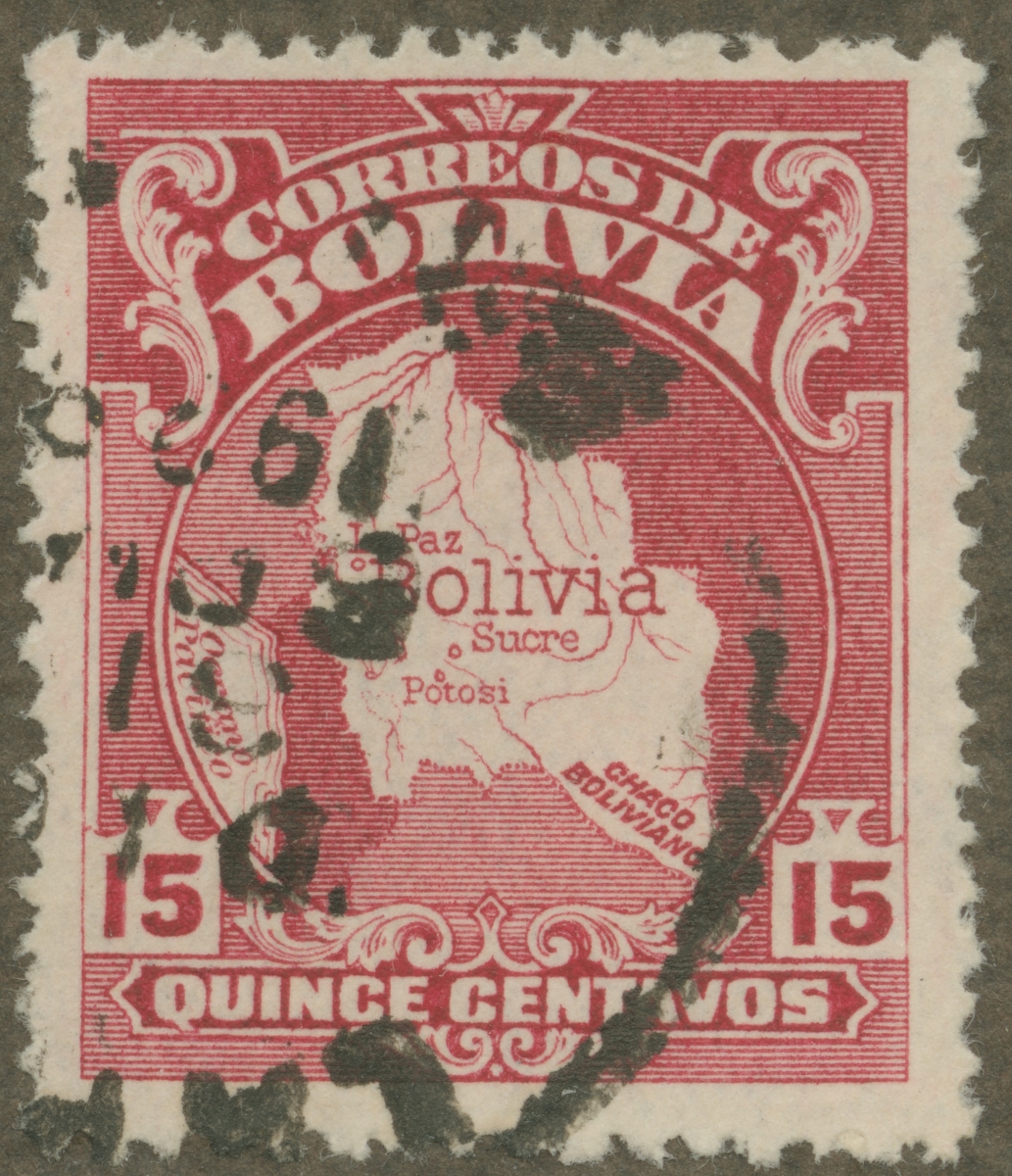 Frimärke från Bolivia, 1928. Motiv av karta över Bolivia.
