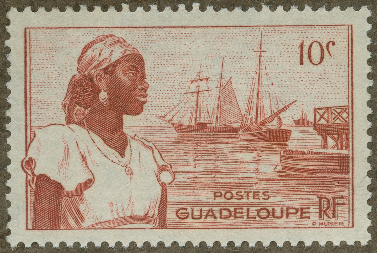 Frimärke ur Gösta Bodmans filatelistiska motivsamling, påbörjad 1950. Frimärke från Fr. West Indies Guadeloupe, 1947. Motiv av kvinna. Segelbåtshamnen.