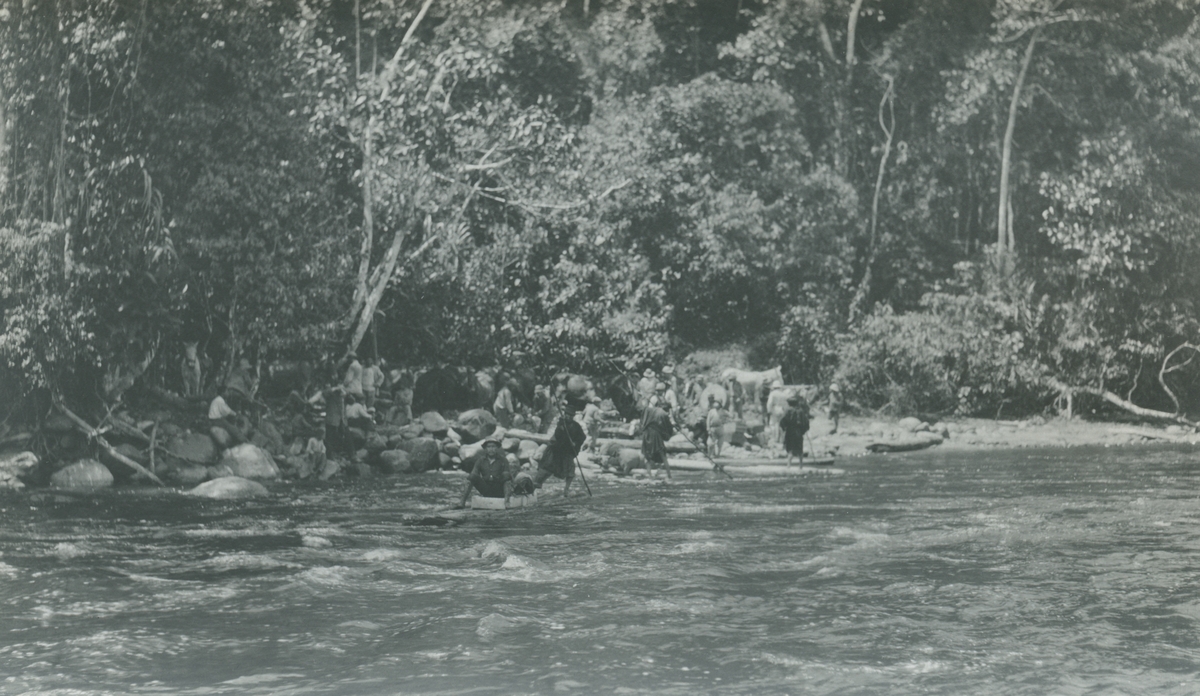 Fotografi från expedition till Peru 1920. Motiv av expeditionsdeltagare vid flod i djungeln.
