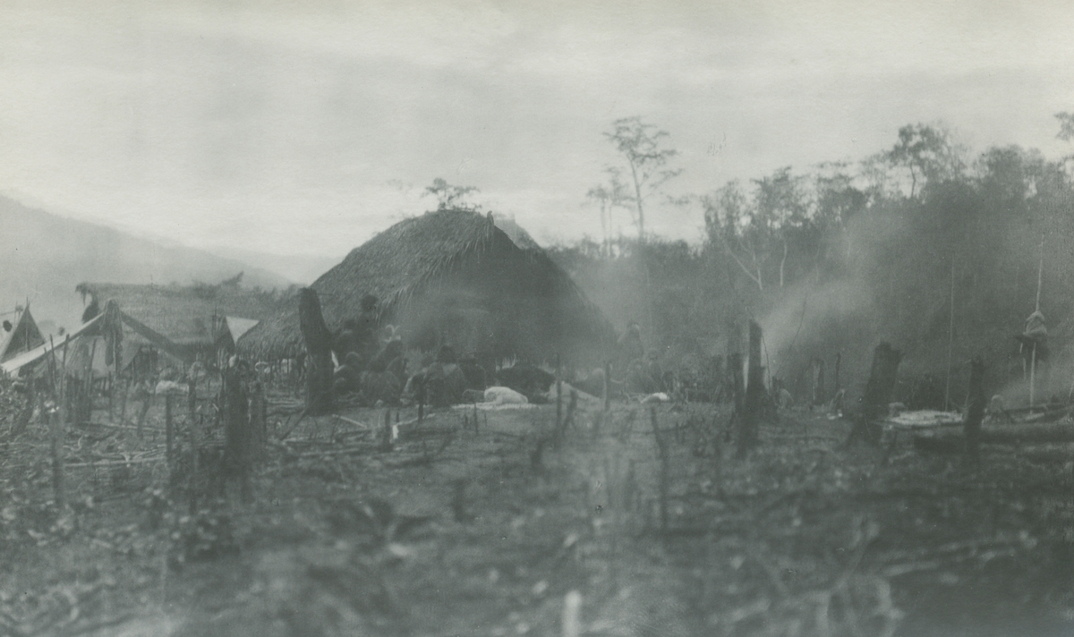 Fotografi från expedition till Peru 1920. Motiv av by i djungeln.