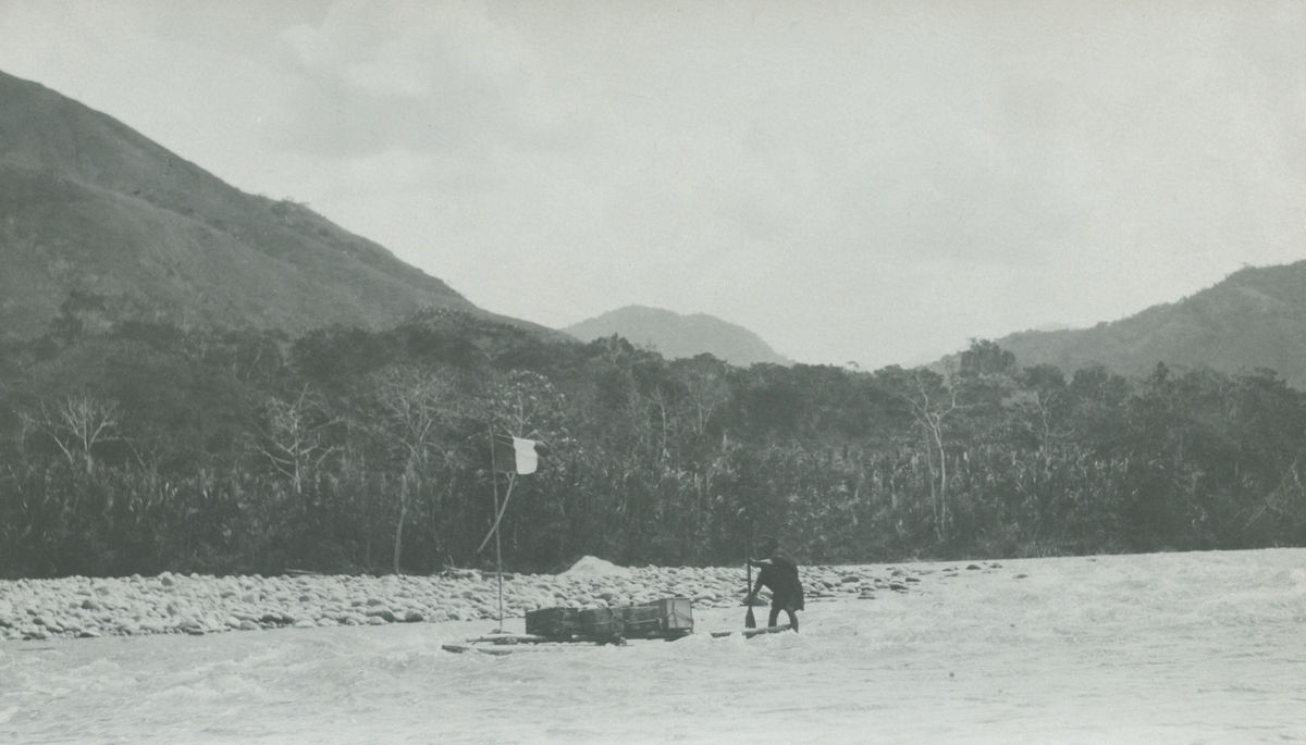 Fotografi från expedition till Peru 1920. Motiv av man på flotte i flod i djungeln.
