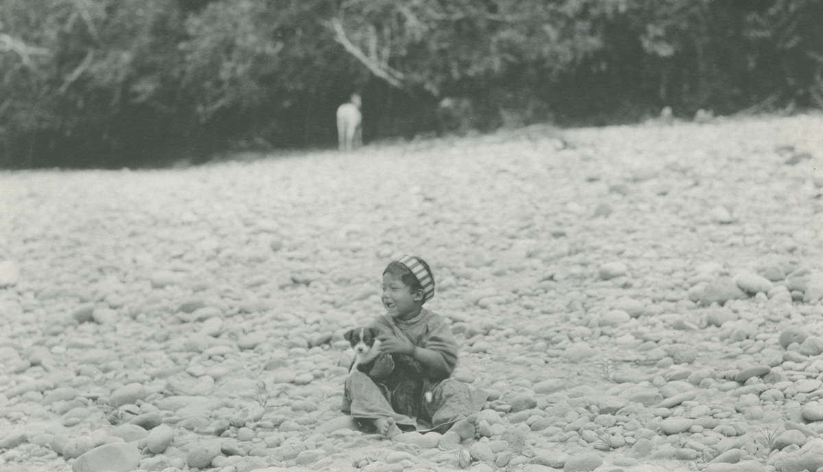 Fotografi från expedition till Peru 1920. Motiv av barn med hundvalp som sitter på stenig mark i djungeln.