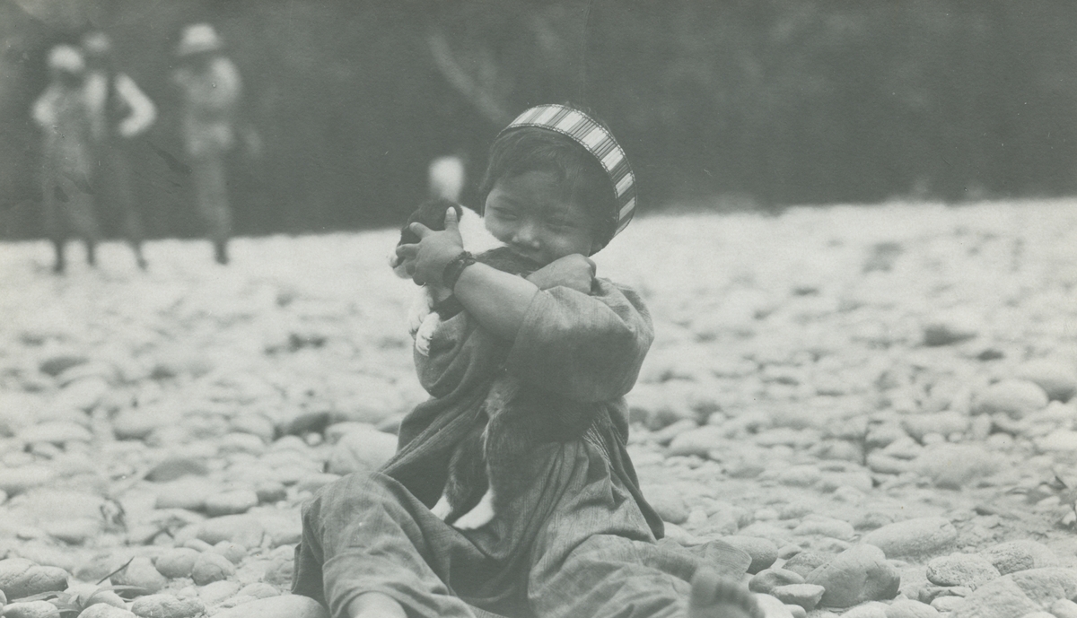 Fotografi från expedition till Peru 1920. Motiv av barn som sitter på stenig mark och kramar om en hundvalp.
