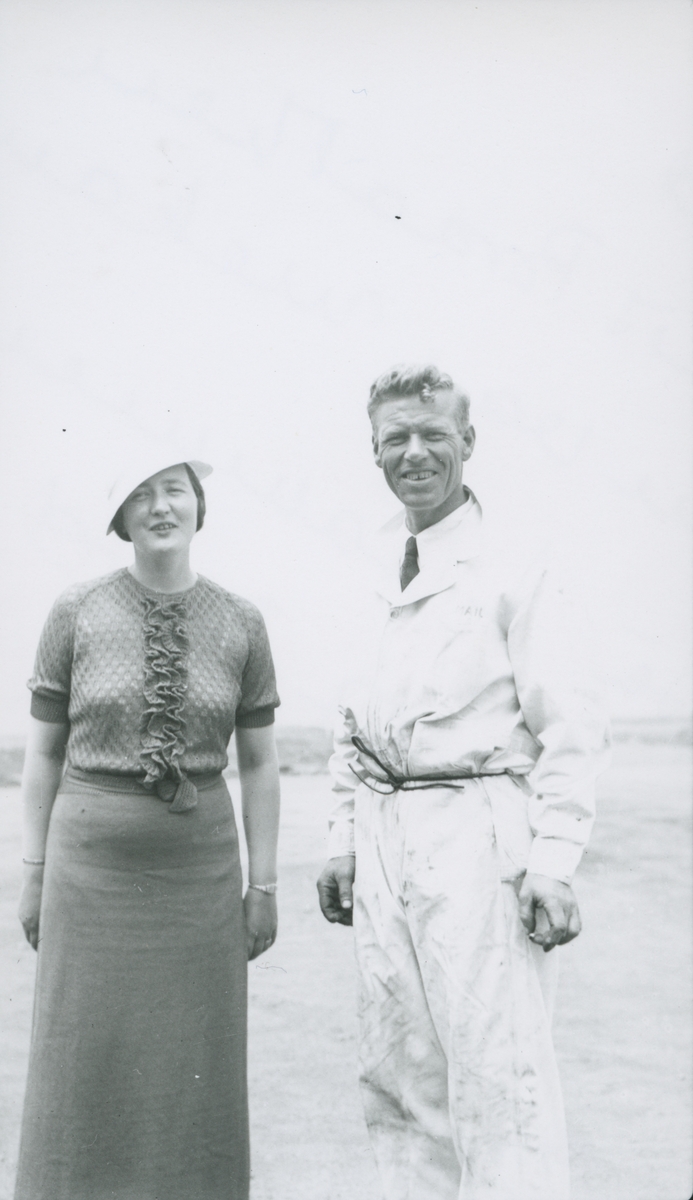 Fotografi från låda märkt Bernt Balchen. Balchen var norsk-amerikansk flygare, polarforskare och militär. Motiv av man vid namn Chris Braathen och kvinna som poserar vid vatten.