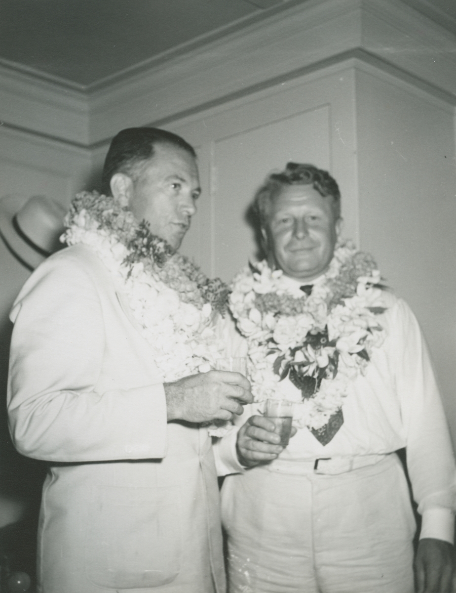 Fotografi från låda märkt Bernt Balchen. Balchen var norsk-amerikansk flygare, polarforskare och militär. Motiv av Balchen och en till man som båda bär flertalet blomsterhalsband.