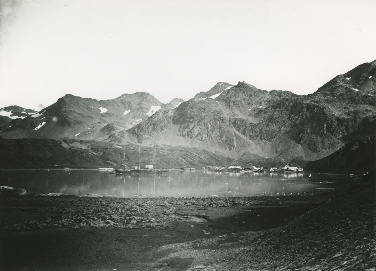 Bild från expedition i Antarktisområdet. Vy över hamn och berg.
