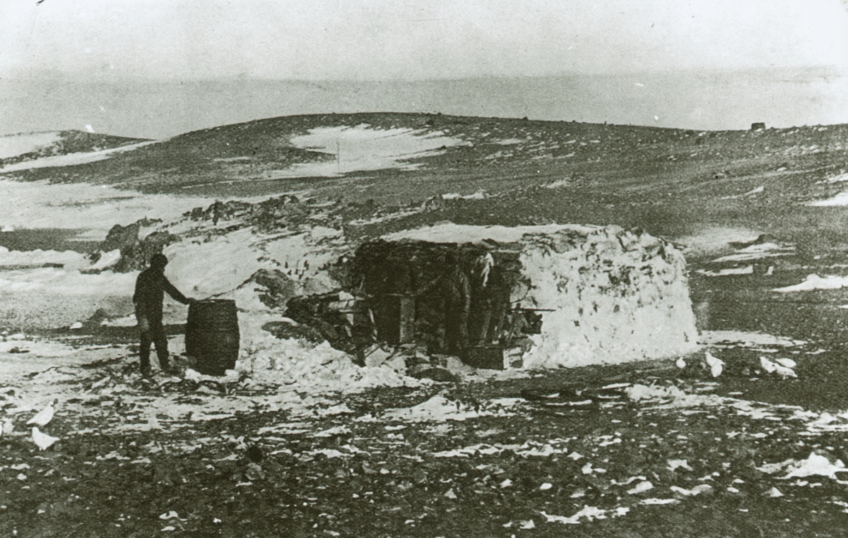 Fotografi från Grönland. Motiv av man vid stenhydda.