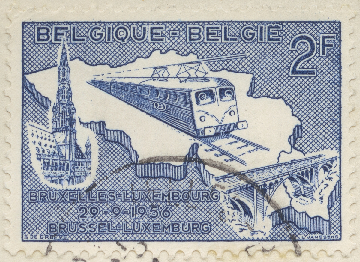 Frimärken ur Gösta Bodmans filatelistiska motivsamling, påbörjad 1950. Frimärke från Belgien, 1956. Motiv av Elektrisk Lokomotiv Brussels stadshus Adolphebron: Luxemb. "- Minne av elektrifieringen av Belgien- Luxembourg linjen den 29 september 1956."
