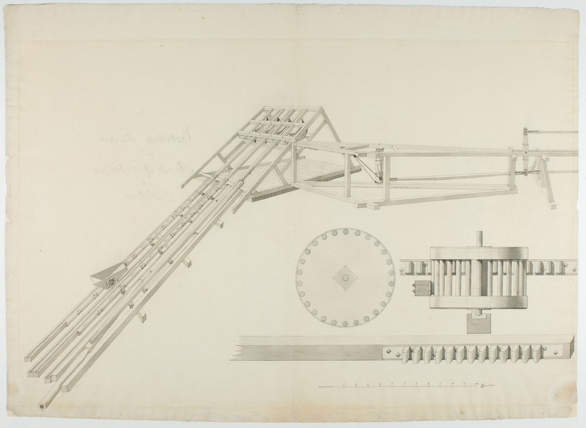 Ritning ur Carl Johan Cronstedts samling. Polhems uppfordringsverk. "Uppfordring Machin ved. Hunbo Jern = Grufva af C: Polheim".