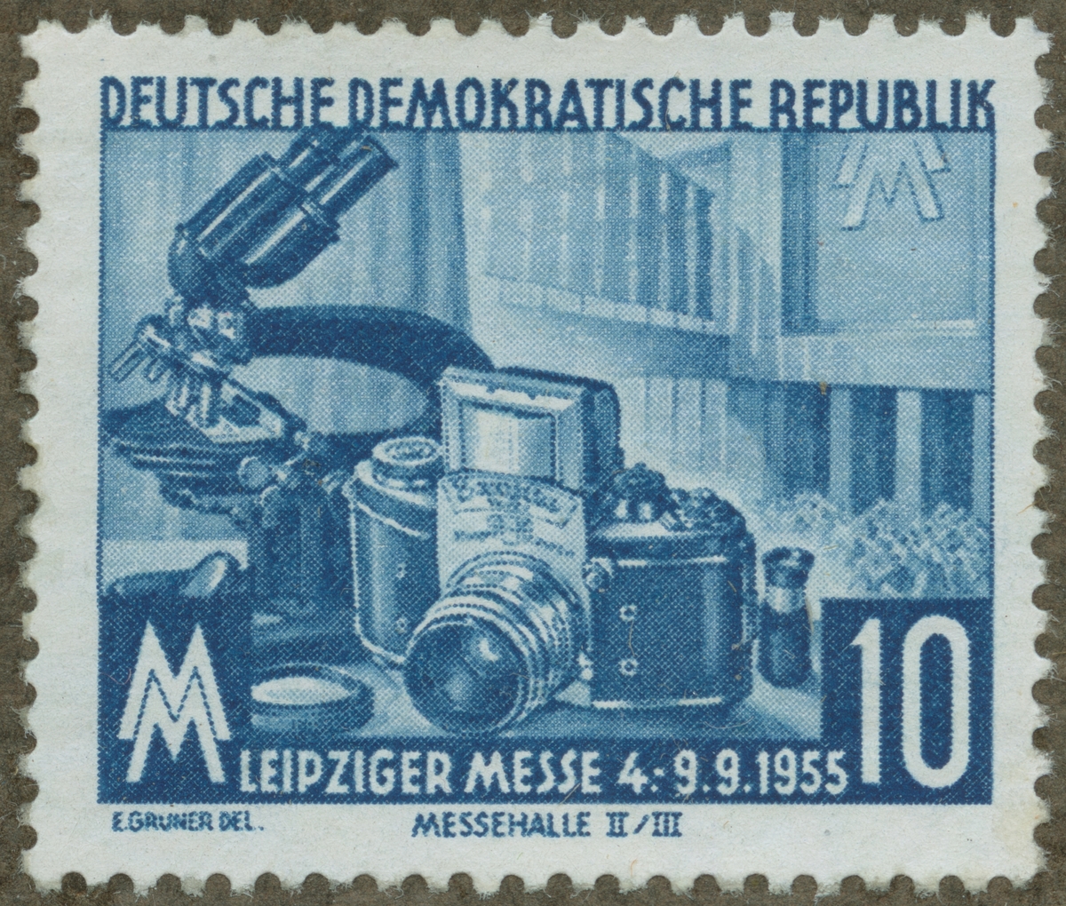 Frimärke ur Gösta Bodmans filatelistiska motivsamling, påbörjad 1950. Frimärke från Öst Tyskland, 1955. Motiv av Tysk optik: Mikroskop, Kamera "Leipziger Mässan 4-9. sept 1955"