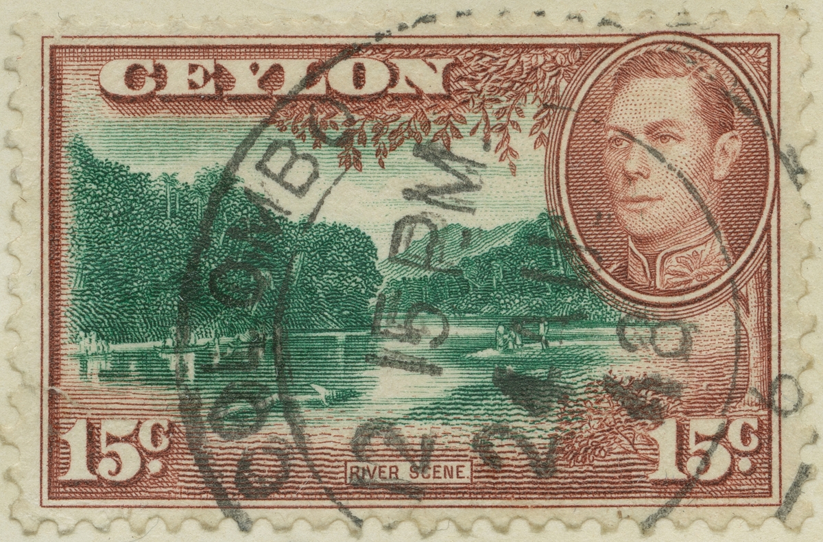 Frimärke ur Gösta Bodmans filatelistiska motivsamling, påbörjad 1950. Frimärke från Indien Ceylon, 1937. Motiv av Strandbild Kung George VI.