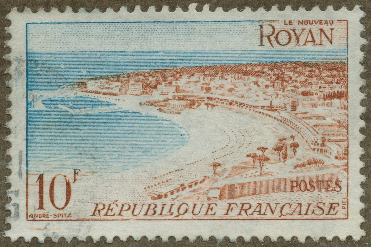 Frimärke ur Gösta Bodmans filatelistiska motivsamling, påbörjad 1950. Frimärke från Frankrike, 1954. Motiv av Royan "På högra stranden av Garonnes mynning Förstklassig badort Turistserie"