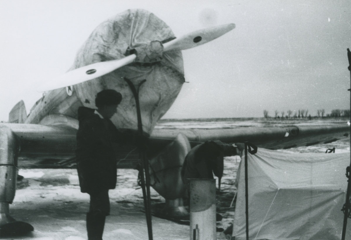 Fotografi från låda märkt Bernt Balchen. Balchen var norsk-amerikansk flygare, polarforskare och militär. Motiv av man och flygplan i snötäckt landskap.