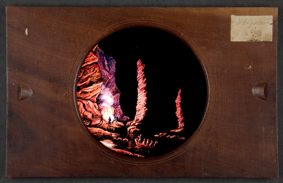 Laterna magica bild målad i färg på glasskiva.