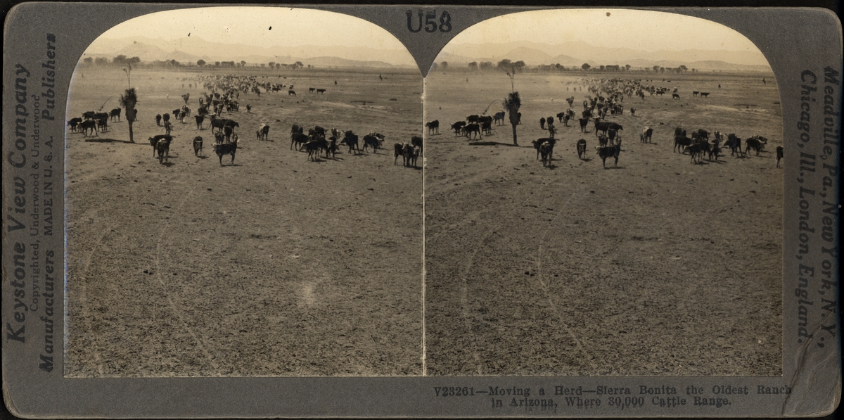 Stereobild av förflyttningen av en hjord kor, Sierra Bonita, Arizonas äldsta ranch, var 30 000 kreatur betar.