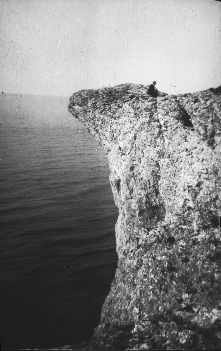 Ljusbild, fotografi från Nordiska arkitekturmötet på Gotland 1920. Man på klippa vid havet.