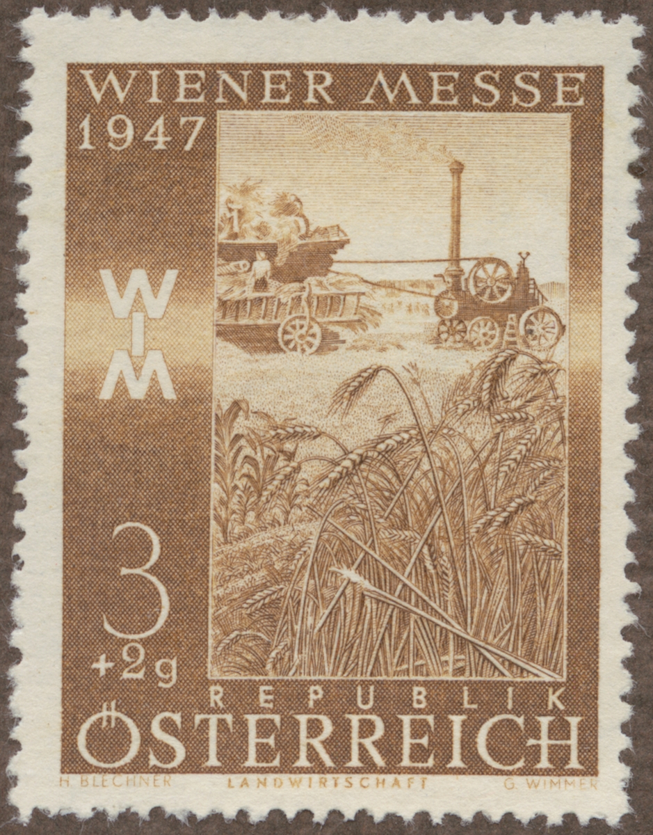 Frimärke från Österrike, 1947. Motiv av Österrikisk tröskmaskin -Wienermässan 1947-