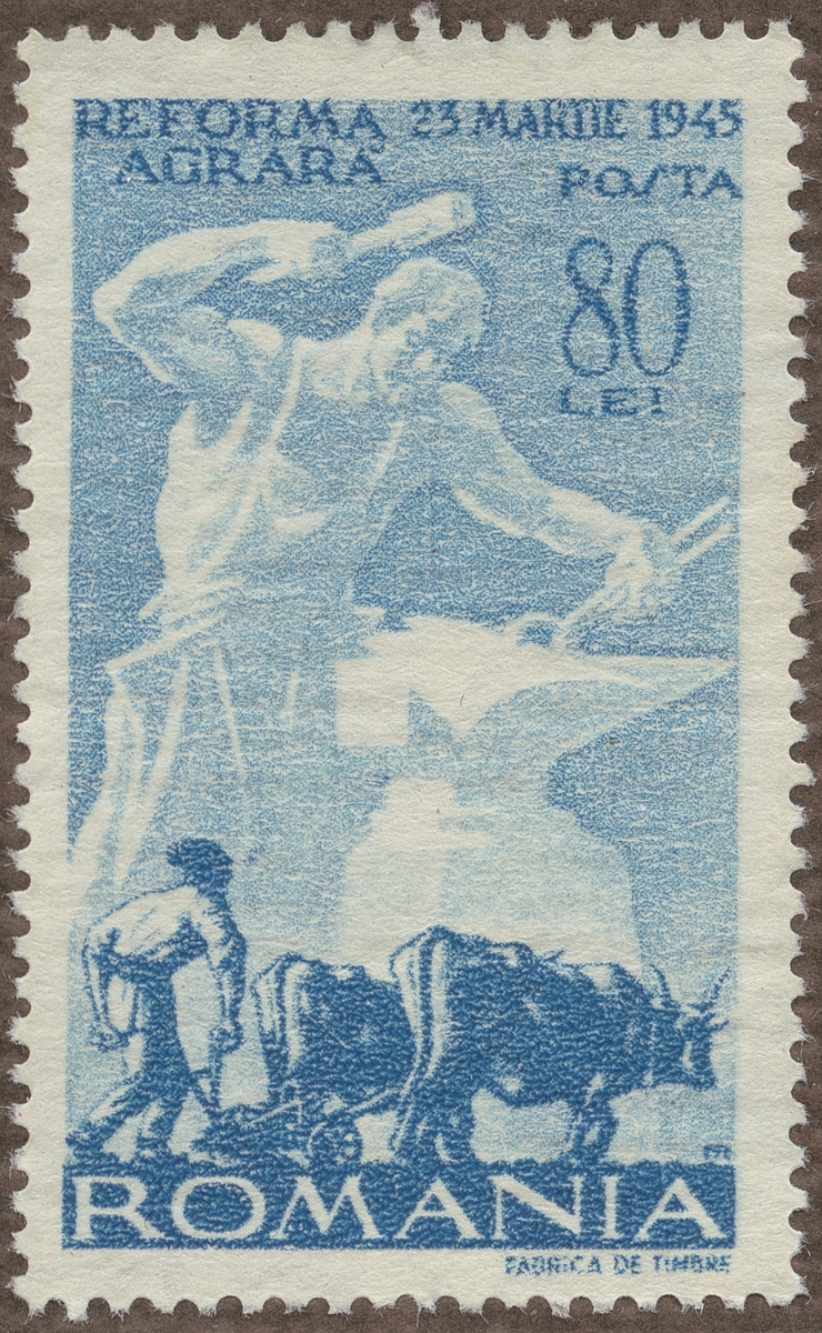 Frimärke från Rumänien, 1946. Motiv av Plöjning med oxar som dragare I bakgrunde: Smed i arbete Agrarreformen 25 mars 1945