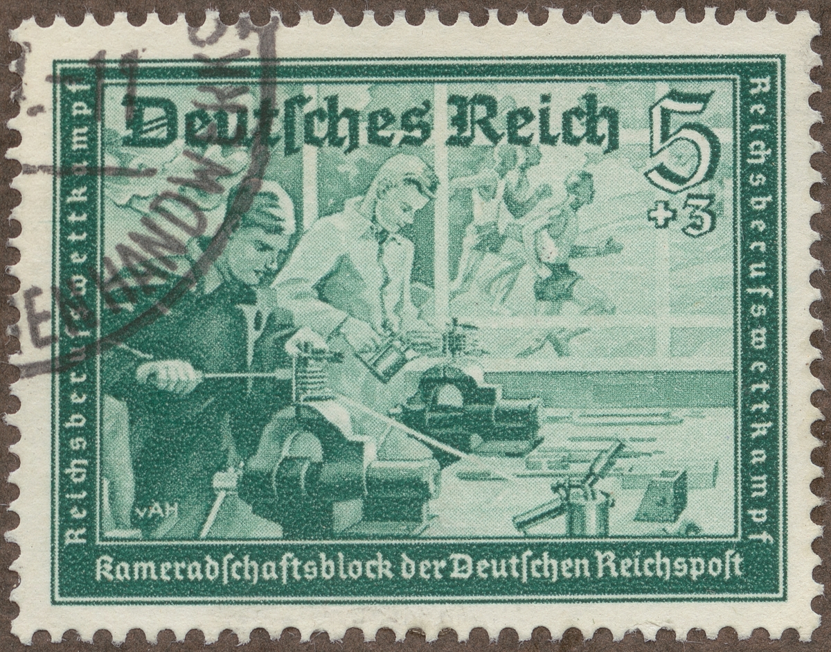 Frimärke från Tyskland, 1939. Motiv av Tävlan i mekaniskt verkstadsarbete "-Serie till förmån för Hitlers nationella kultur fond samt för postverkets personal-"
