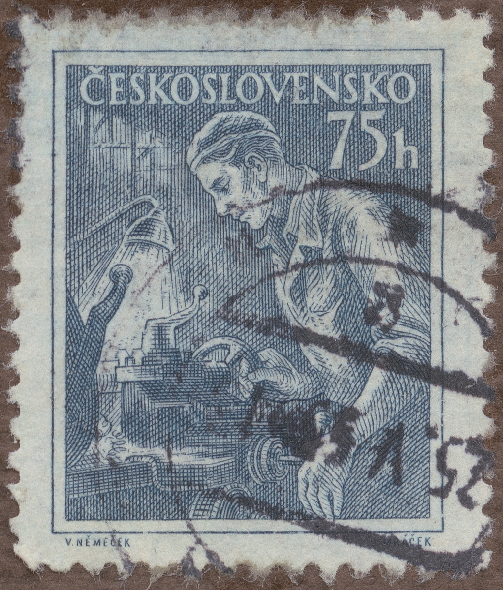 Frimärke från Tjeckoslovakien, 1954. Motiv av Mekaniska verkstad med arbetare "Serie: olika yrken"