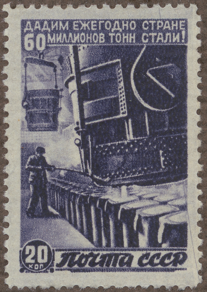 Frimärke från Ryssland, 1946. Motiv av Ståltappning i kokiller Rysk järnindustri Stalins fem-årsplan