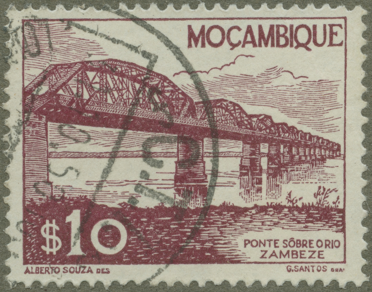 Frimärke från Moçambique, 1948. Motiv av En lång bro över Zambesifloden; fackverkskonstruktion.