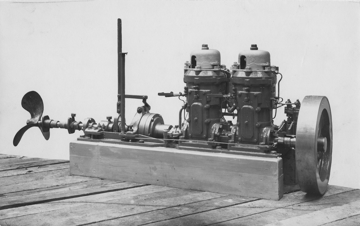 Båtmotor med mekanisk backanordning. Tändkulemotor av svenskt fabrikat.