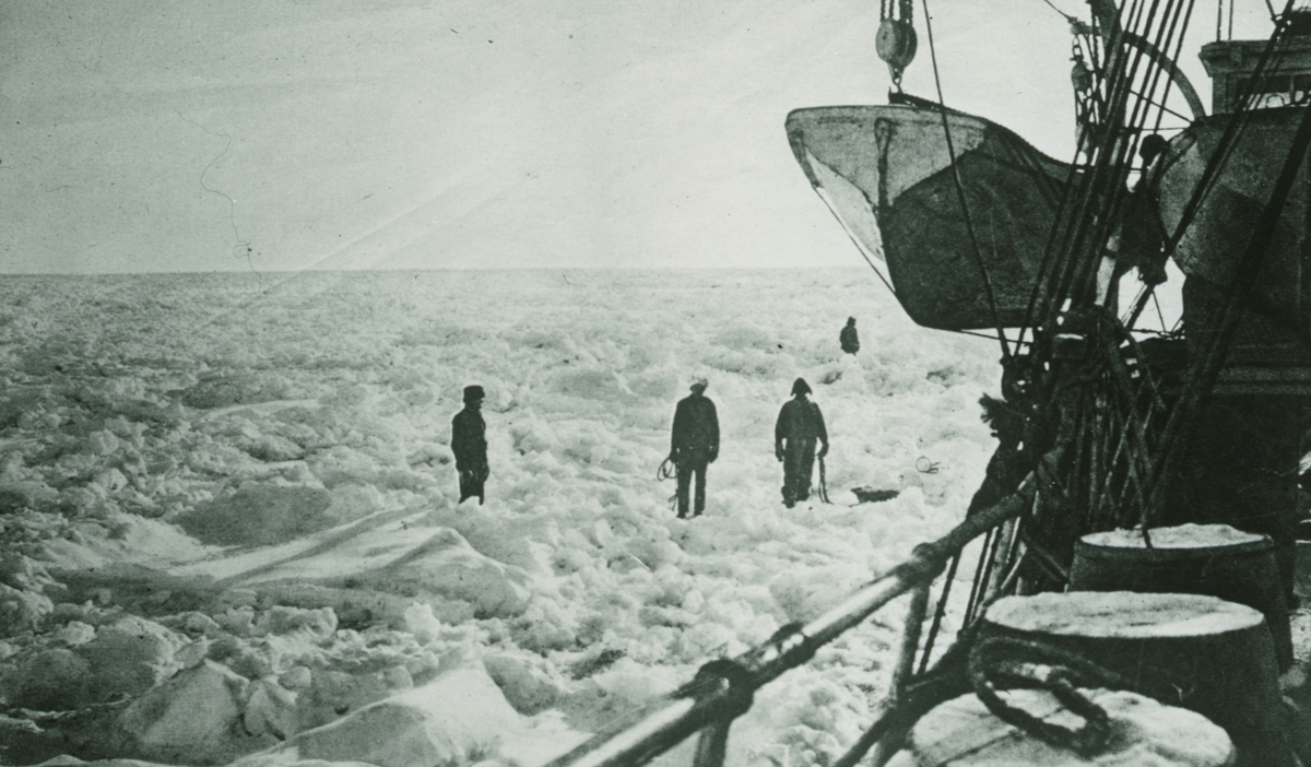 Fotografi från Grönland. Motiv av män i snö bredvid fartyg.