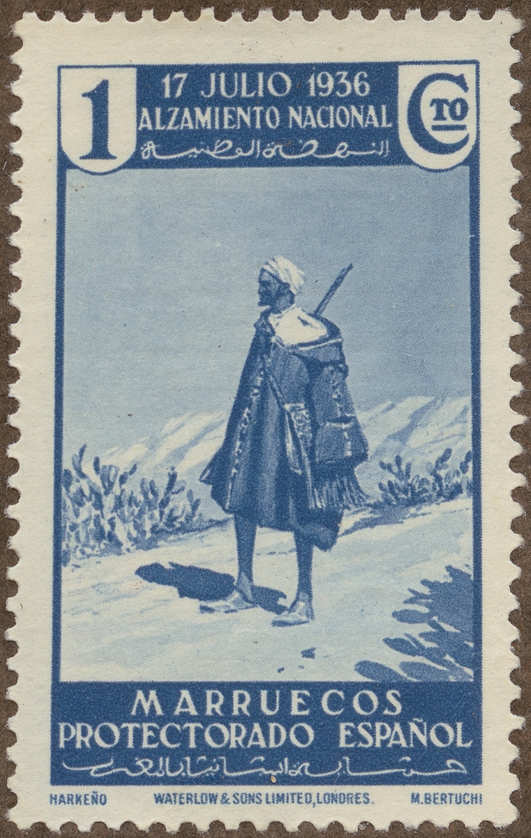 Frimärke från Spanska Marocko, 1937. Motiv av "Harkeno": Marockansk soldat 17 juli 1936 -1-årsminne av Spanska Inbördeskriget: 1936-1937.