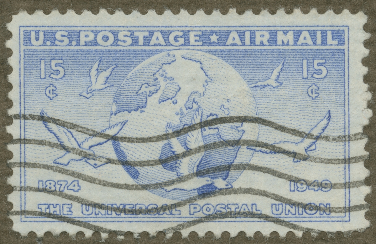Frimärke från USA, 1949. Motiv av jordglob och brevduvor. "Symbol för världspostföreningen. 75-årsminne av föreningens stiftande".