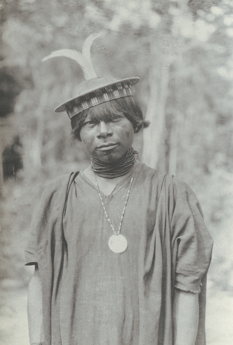Fotografi från kuvert märkt med "Ernst Nordenskjöld". Porträtt av man med fjäder i sin hatt och halssmycke.