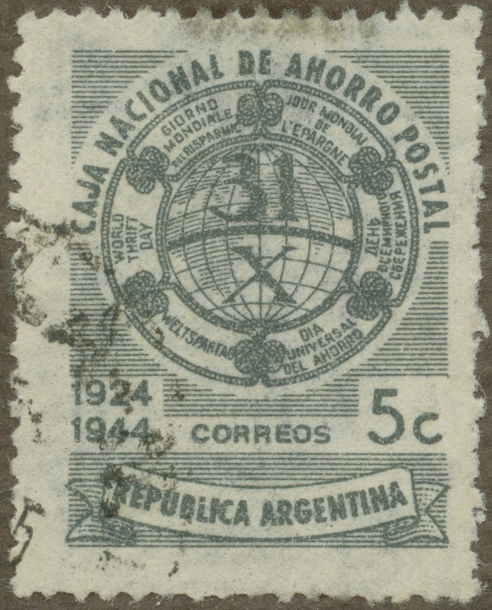 Frimärke ur Gösta Bodmans filatelistiska motivsamling, påbörjad 1950. Frimärke från Argentina, 1944. Motiv av Jordglob "Internationella Sparandets Dag: 31 okt. 1944- 20-årsminne av argentinska Sparbanken"