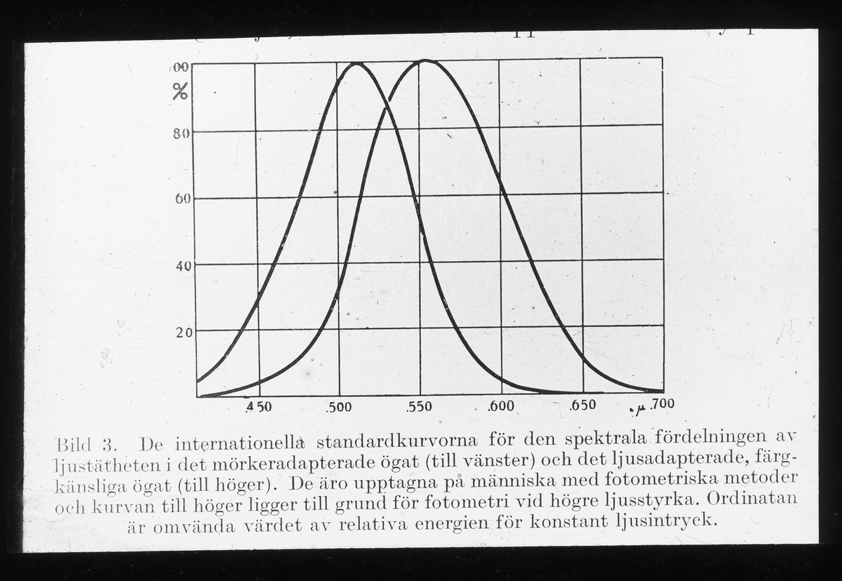 De internationella standardkurvorna för den spektrala fördelningen av ljustätheten i det mörkerdapterade ögat (till vänster) och det ljusadepterade, färgkänsliga ögat (till höger).