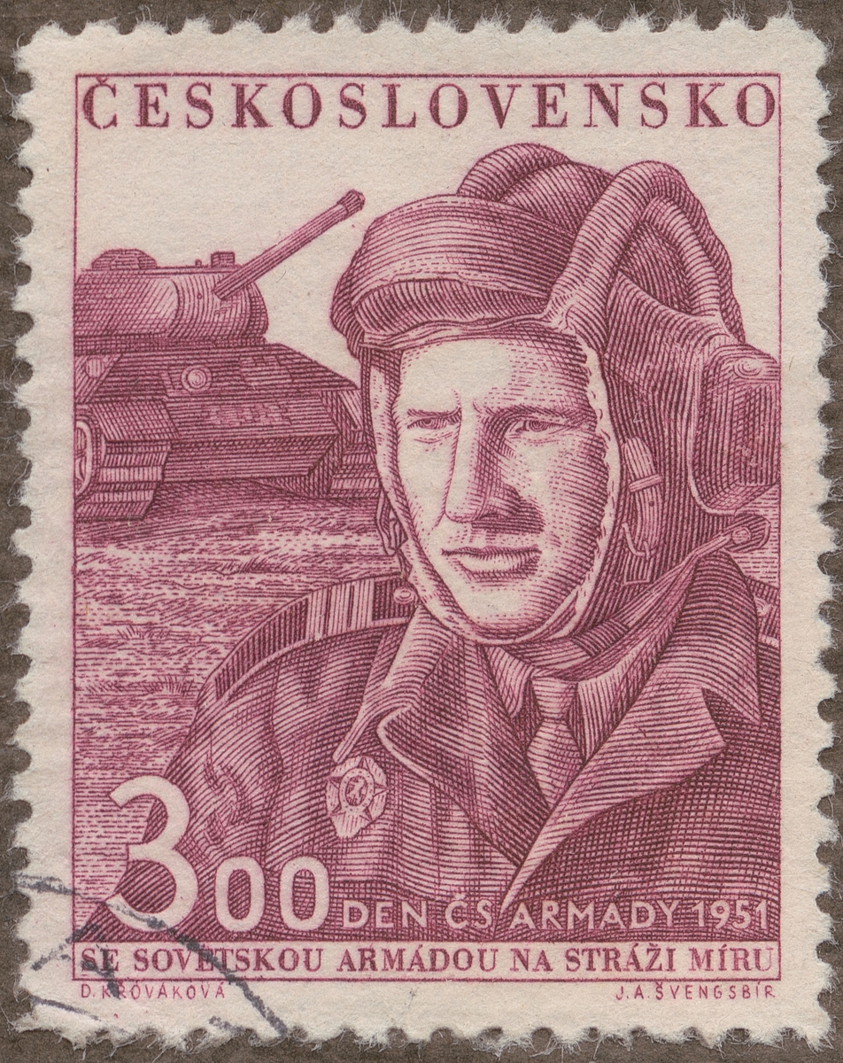 Frimärke från Tscheckoslovakiet, 1951. Motiv av Lätt kanon på motorfordon. Härens Dag 6 Oktober 1951-