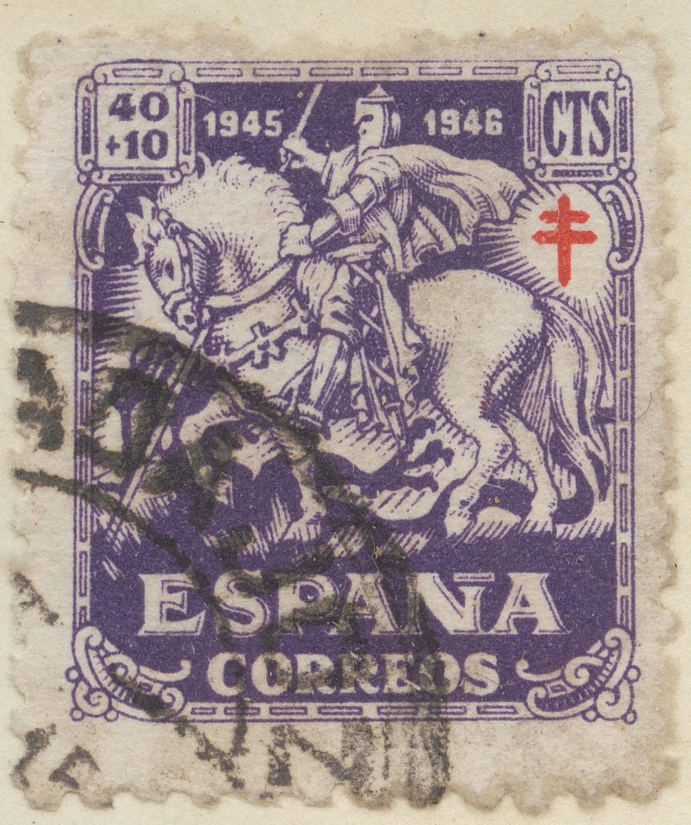 Frimärke från Spanien, 1945. Motiv av Medeltidssriddare med lans -Lorrainekorset- -Till förmån för TBC-hälsovård-