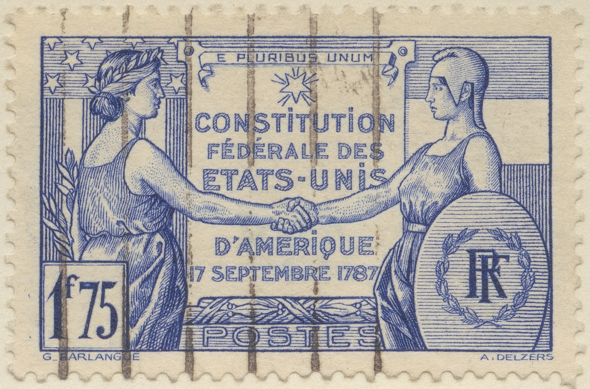 Frimärke från Frankrike, 1937. Motiv av Flaggor: USA och Frankrike Symboliskt Handslag Frankrike och U.S.A. - Honnör åt USA: 150-årsminne av USA:s författning: 1787-1937-
