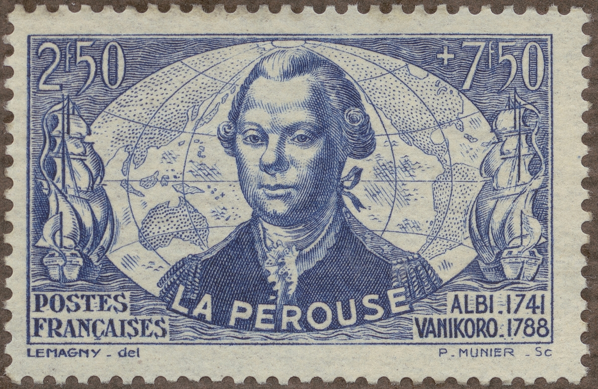 Frimärke från Frankrike, 1941. Motiv av Franska segelskepp mitten av 1700-talet Greve Jean-Françoise de La Perouse 1741-1788. Fransk navigatör. Blev 1782 av Louis XVI utskickat på forskningsresa i Stillehavsområdet. Expeditionen förliste nära Australien och dens öde var ett mysterium tills man 1827 fann spillror av den på en Stillehavsö. 200-årsminne av hans födelse: 1747-1941.