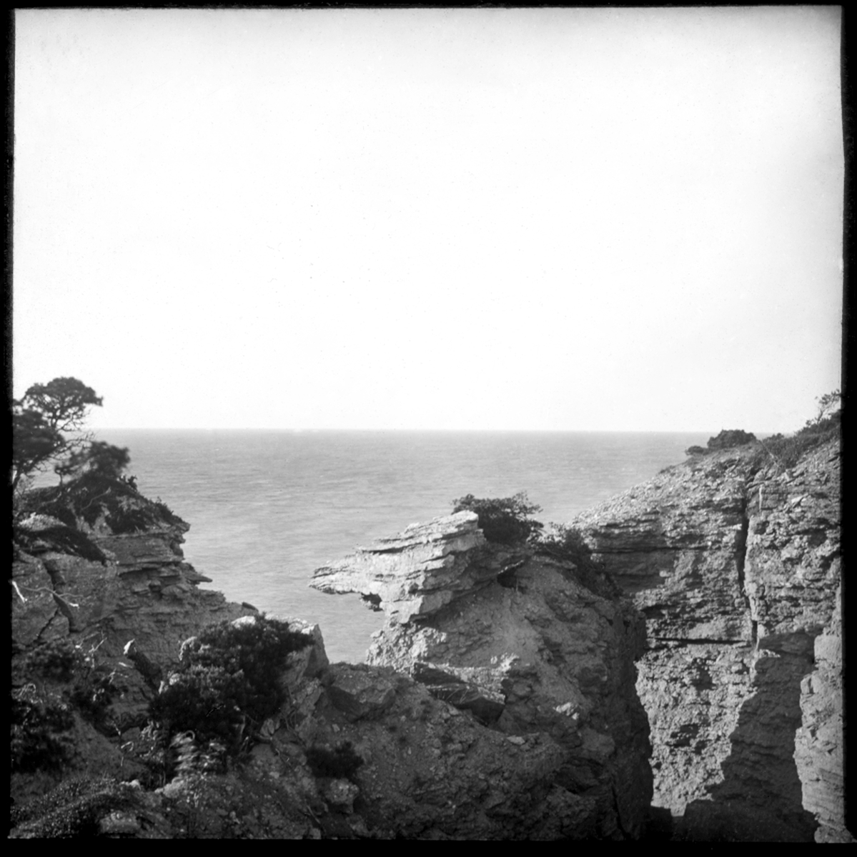 Skioptikonbild från institutionen för fotografi vid Kungliga Tekniska Högskolan. Motiv föreställande utsikt mot havet, sannolikt på Gotland. Bilden är troligen tagen av John Hertzberg under en resa i Sverige.