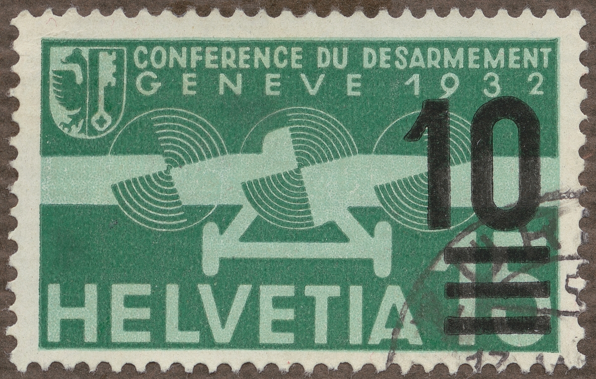 Frimärke från Schweiz, 1932. Motiv av Symbol Tre-motorigt monoplan "Avrustningskongress i Genéve 1932"