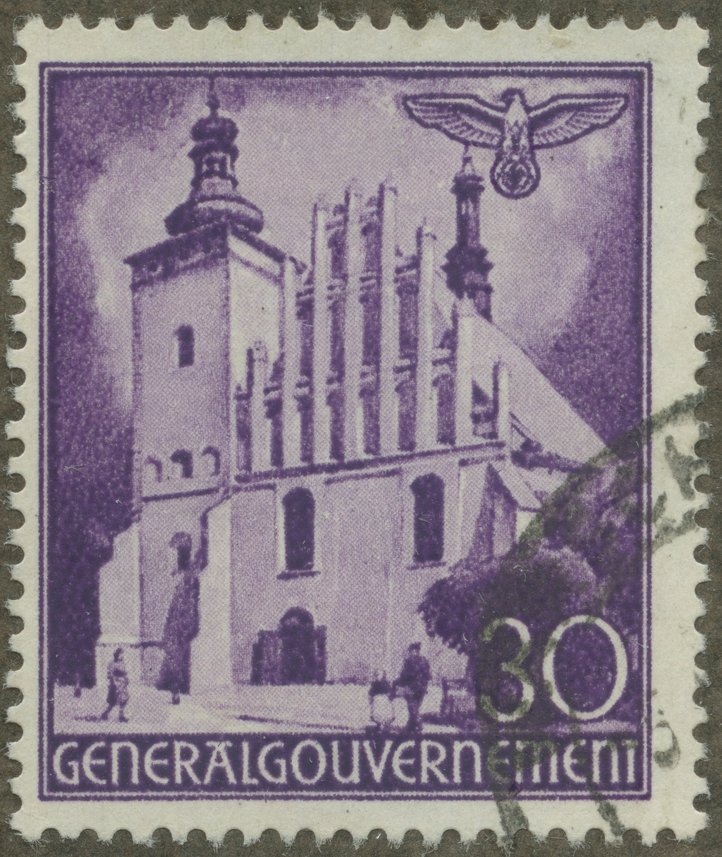 Frimärke från Polen, 1940. Motiv av en gammal kyrka i Lubin. "Tyska okkupationen världskrig II".