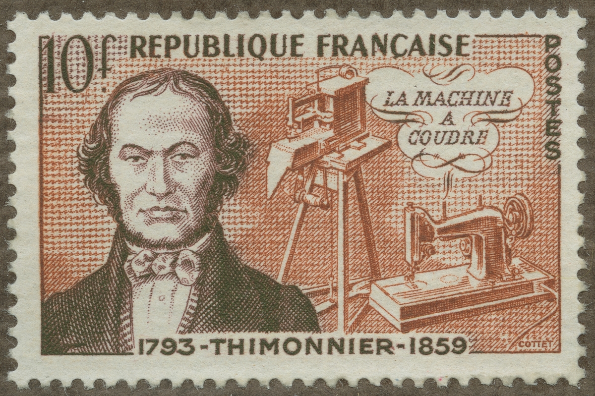 Frimärke från Frankrike, 1955. Motiv av Fransmannen Barthélemy Thimonnier -1793-1859- 1830: patent på en kedjestygnssymaskin. Mötte stort motstånd från skräddarne i Frankrike.