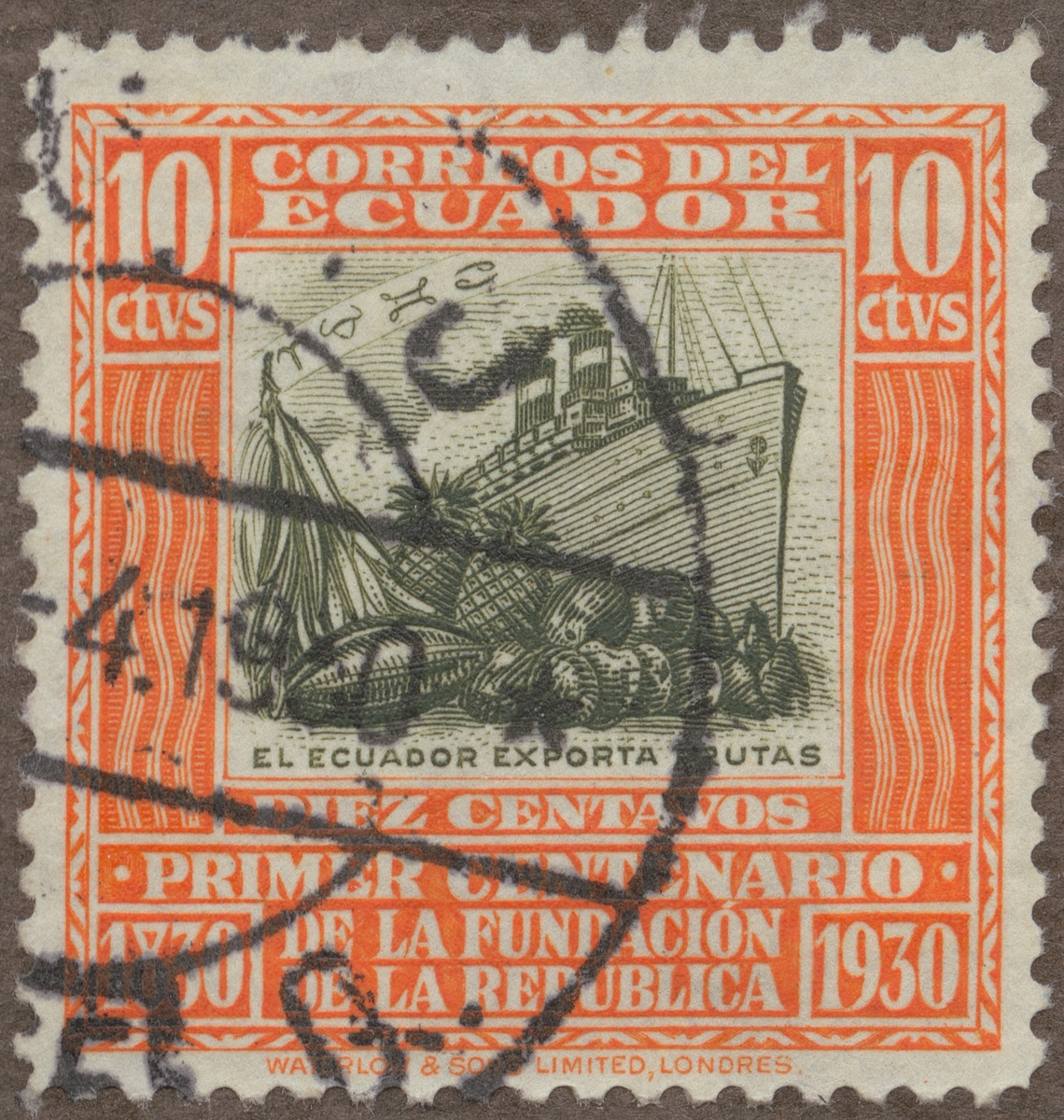 Frimärke från Ecuador, 1930. Motiv av fartyg med förstorade exportfrukter. "100-årsminne: Republikens grundande".
