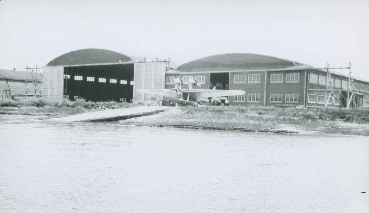 Fotografi från låda märkt Bernt Balchen. Balchen var norsk-amerikansk flygare, polarforskare och militär. Motiv av flygbåt utanför flyghangar.