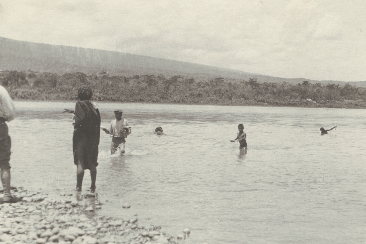 Fotografi från kuvert märkt med "Ernst Nordenskjöld". Motiv av män och pojkar som badar i flod i djungeln.