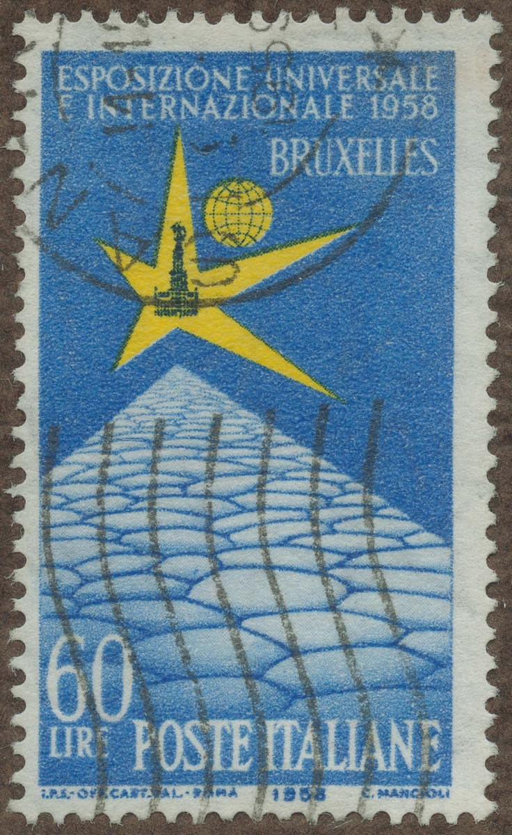 Frimärke från Italien, 1958. Motiv av Stjärna Jordglob Symboler: Utställn. Bryssel 1958.